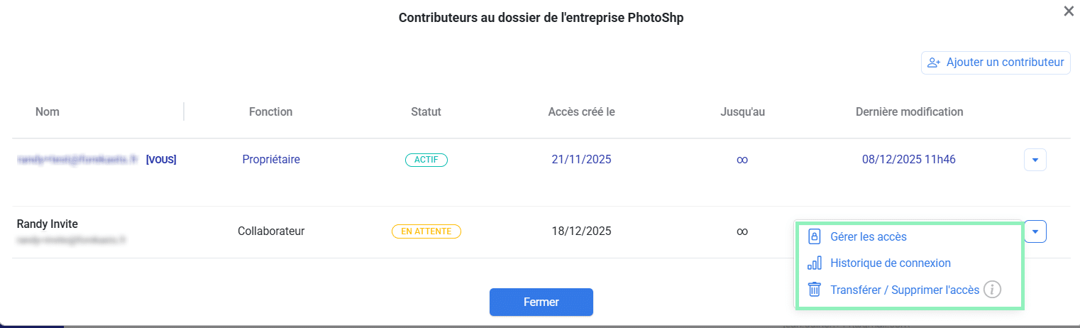 Depuis la fenêtre de gestion des contributeurs vous pouvez modifier les accès de chacune des personnes déjà invitées sur le dossier : modifier la date limite et les droits d’accès aux différents modules, suspendre, supprimer ou transférer définitivement l’accès, ou encore visualiser l’historique de connexion du contributeur au dossier.