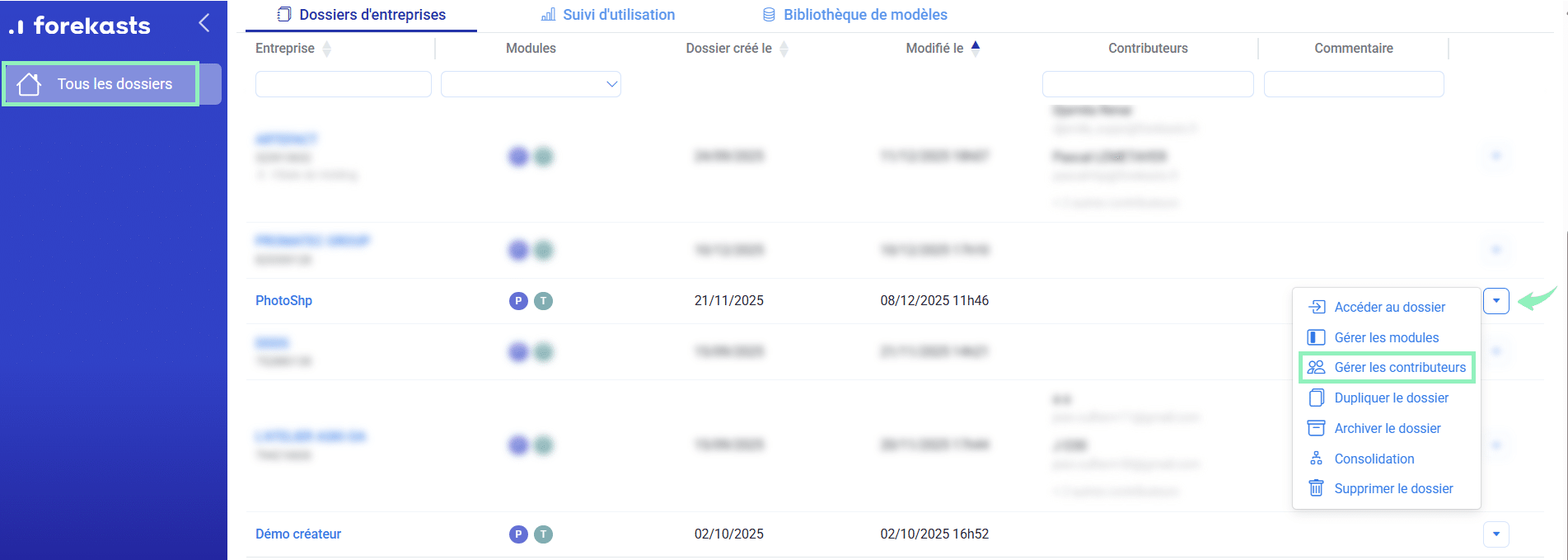 Avec l’offre Accompagnement, Forekasts vous permet de travailler en collaboration sur vos dossiers d’entreprise. Une fois votre dossier créé et à tout moment de votre progression, vous pouvez inviter gratuitement des contributeurs et gérer leurs autorisations d’accès.