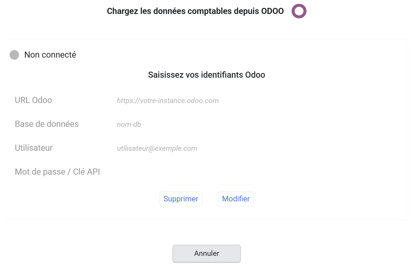 - Renseignez vos informations de connexion Odoo :
