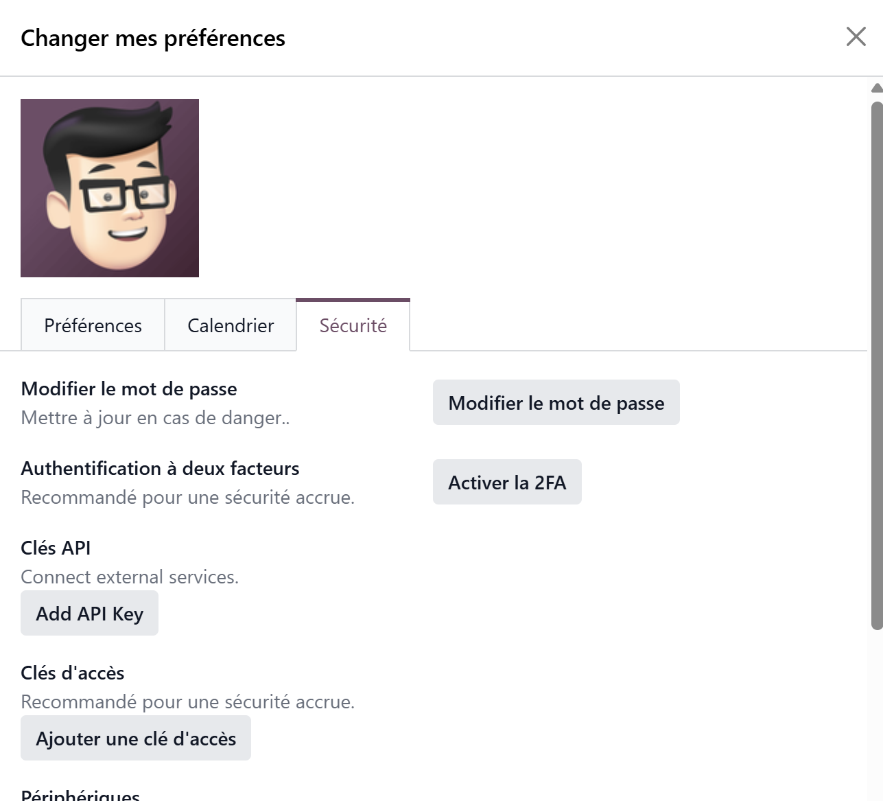 La clé API, méthode recommandée, est à récupérer via l’interface Odoo, dans votre menu utilisateur, puis menu « Mes préférences », onglet « Sécurité », « Ajout clé API ». Voir la documentation officiel Odoo.