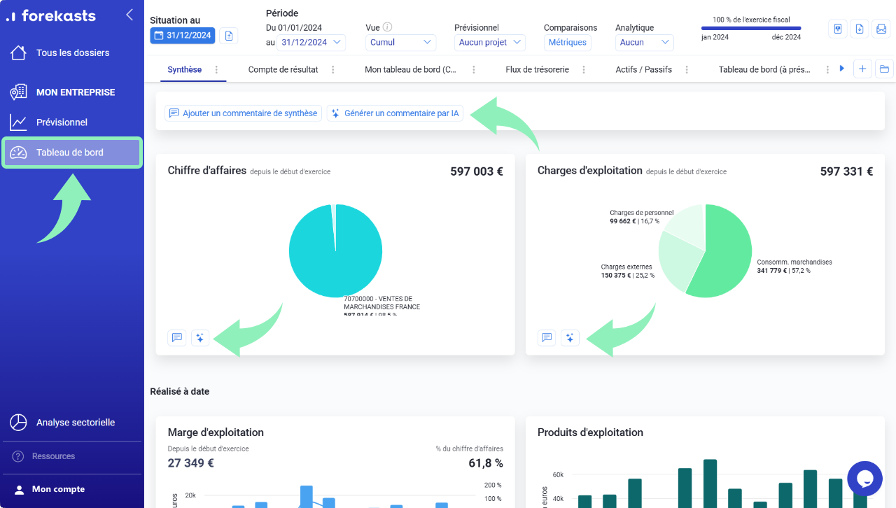 L’assistant IA de Forekasts est là pour vous aider à comprendre rapidement votre situation financière et prioriser les points d’attention. Basé sur l’intelligence artificielle, il agit comme un directeur financier : il peut analyser un tableau de bord complet ou commenter un widget en particulier, en s’appuyant sur vos données et vos instructions.