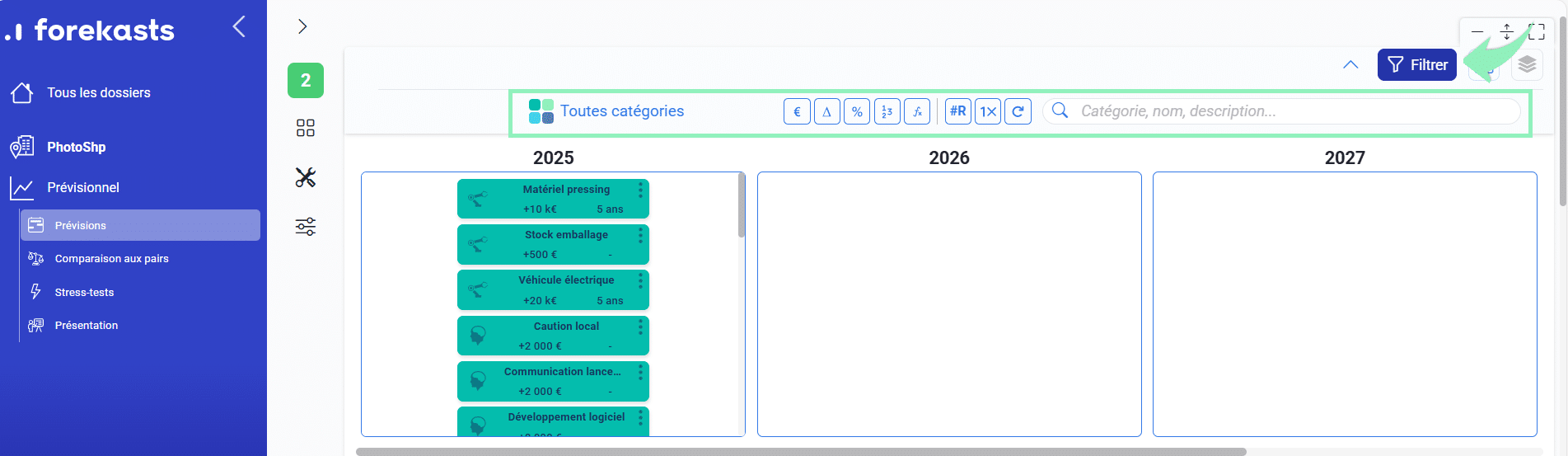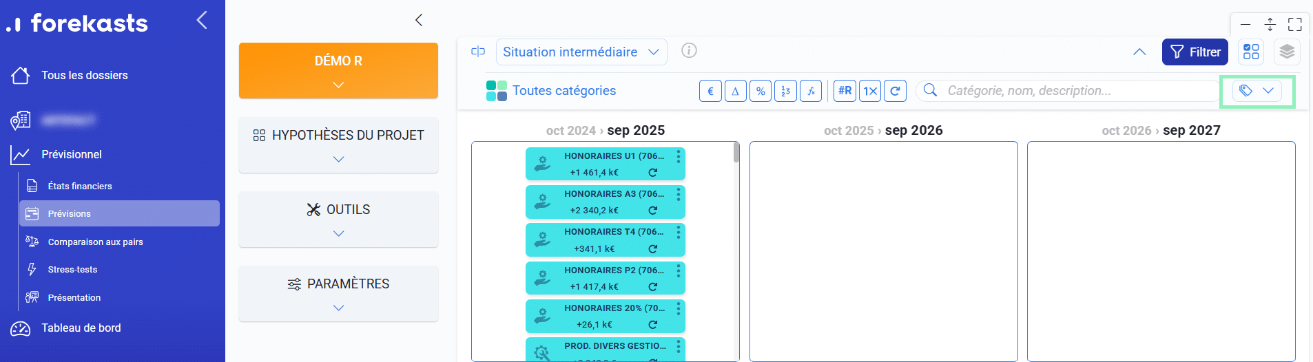 Les filtres sont disponibles dans le module Prévisions, du côté droit de l’écran via le bouton